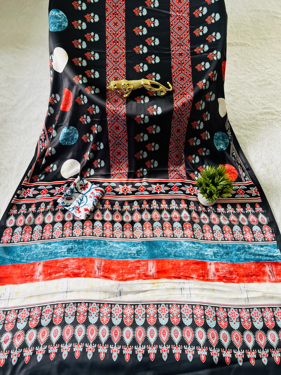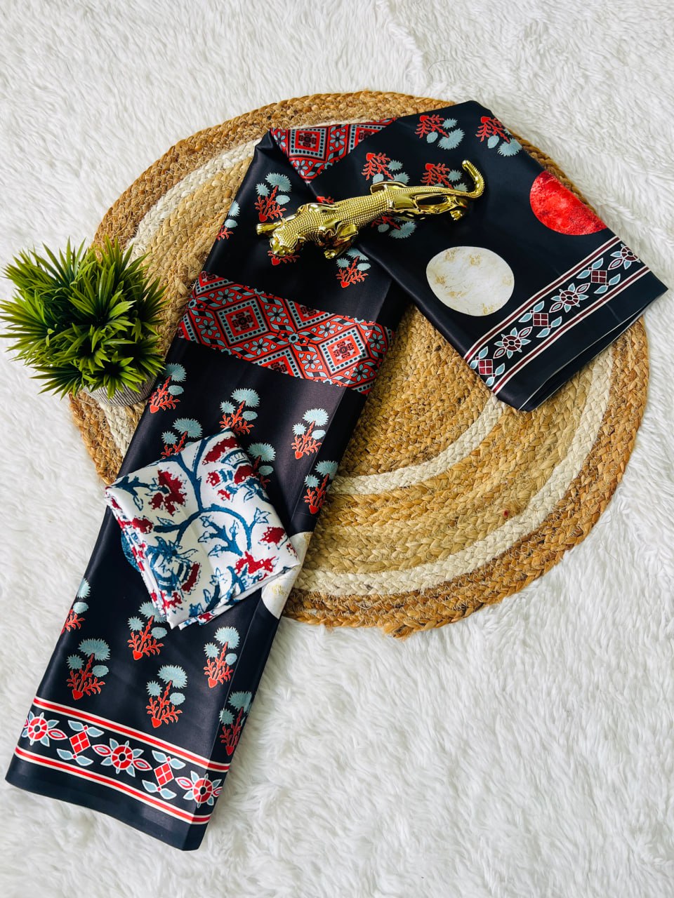 Work : Digital Print Border with Ajrakh Rich Pallu with Contrast Blouse
