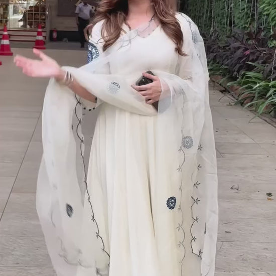 Step into pure elegance with this ethereal white Anarkali suit, designed with timeless Bollywood charm. 🌸 Crafted from soft, flowy fabric, it features: