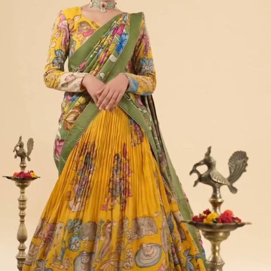 Chinon Kalamkari Print Designer Lehenga Choli with Lace Border Dupatta