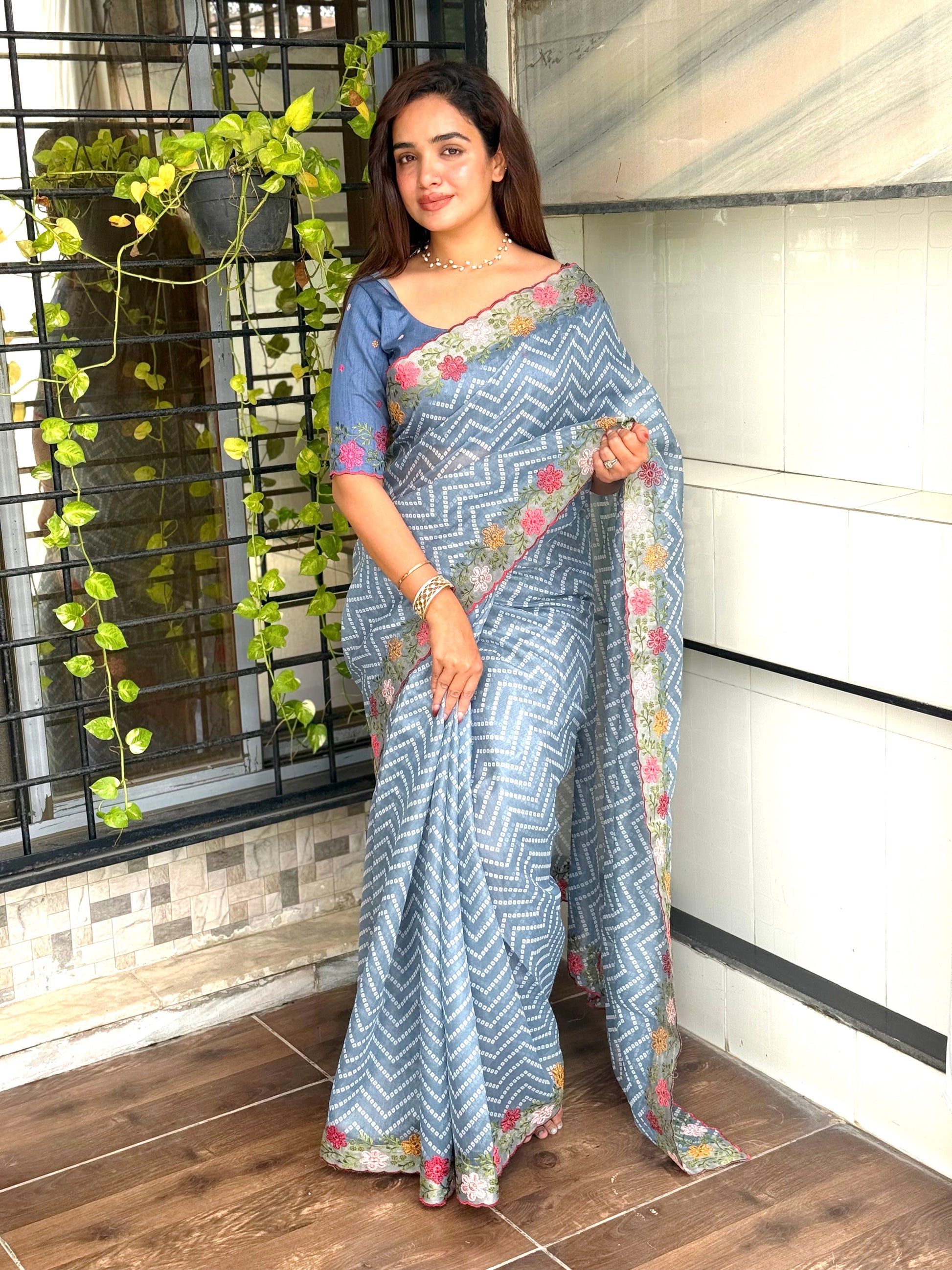 Work & Pattern: Embroidered work on saree with zari border, bandhej print on saree, embroidered blouse