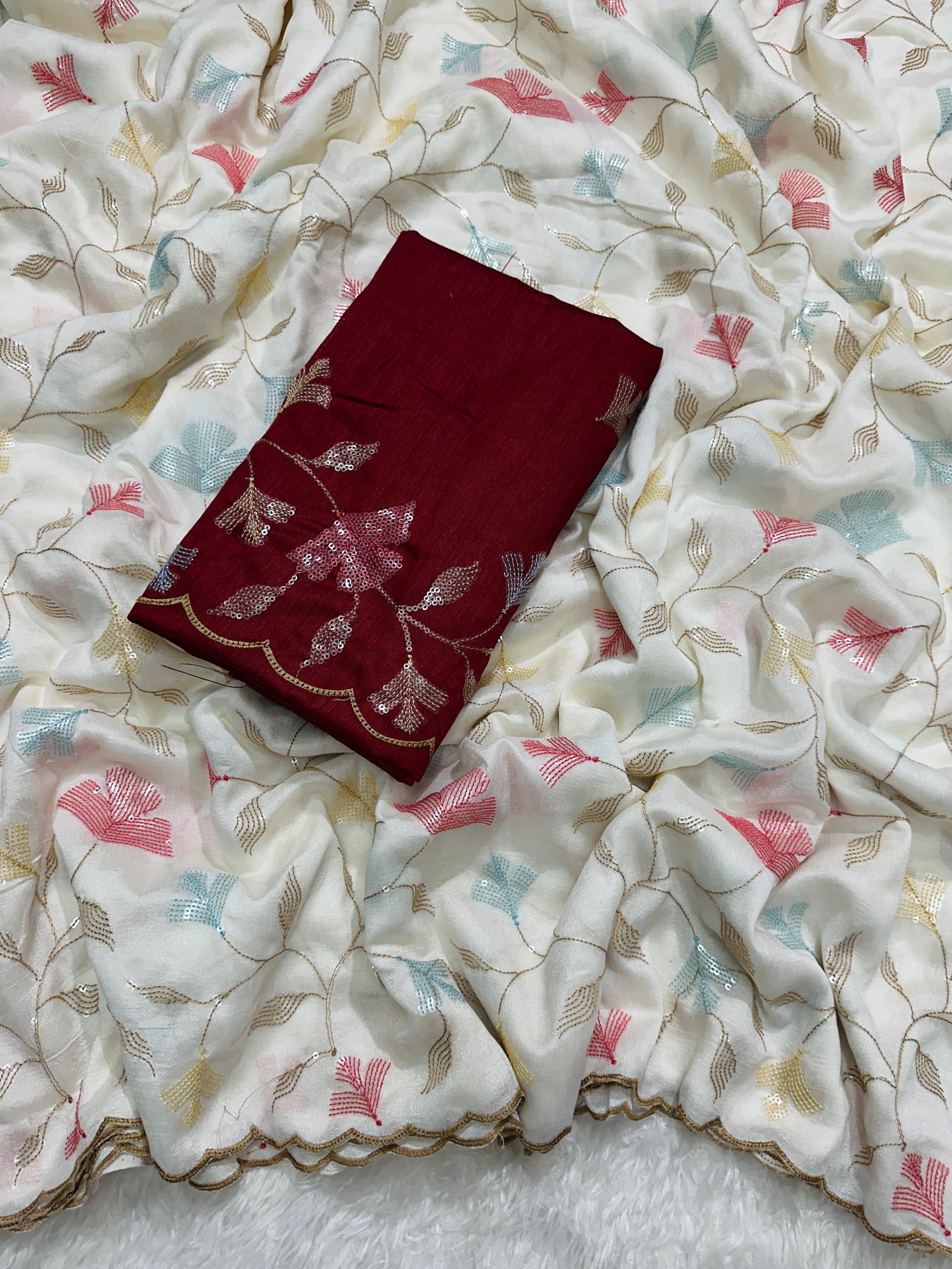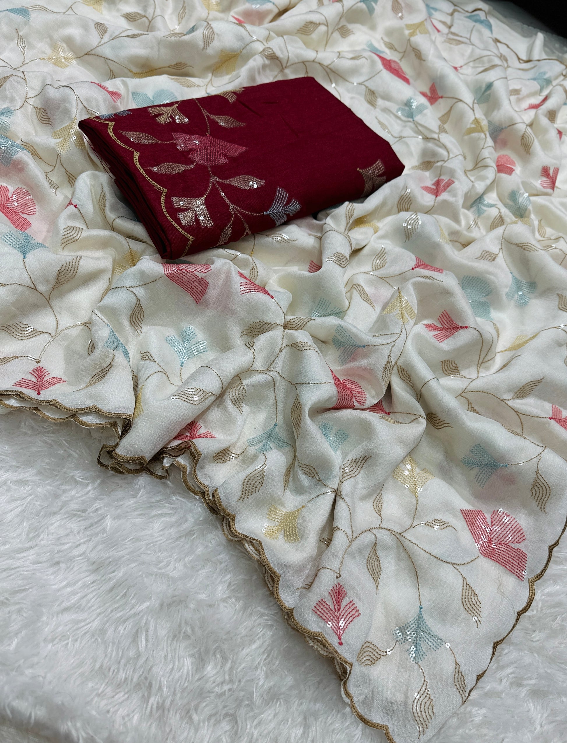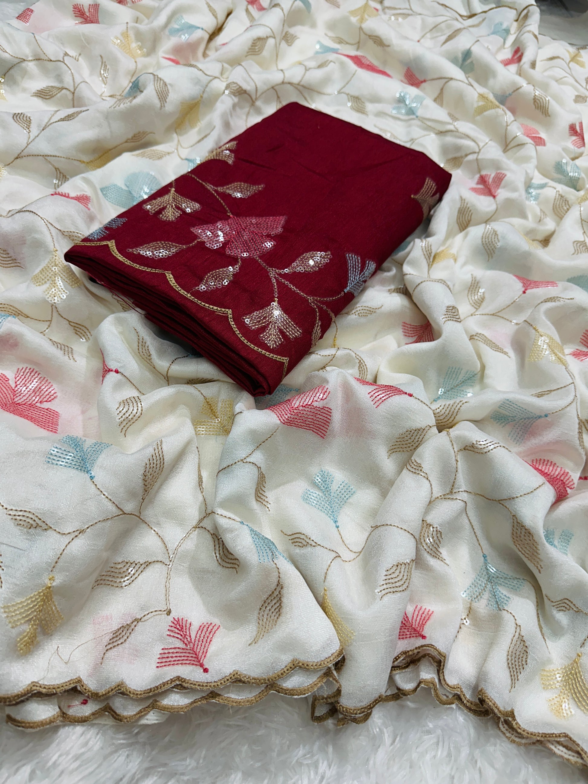 Saree: Premium Crush Georgette Chiffon Silk with delicate multi-thread & sequins embroidery work finished with a beautiful gold zari arco border.