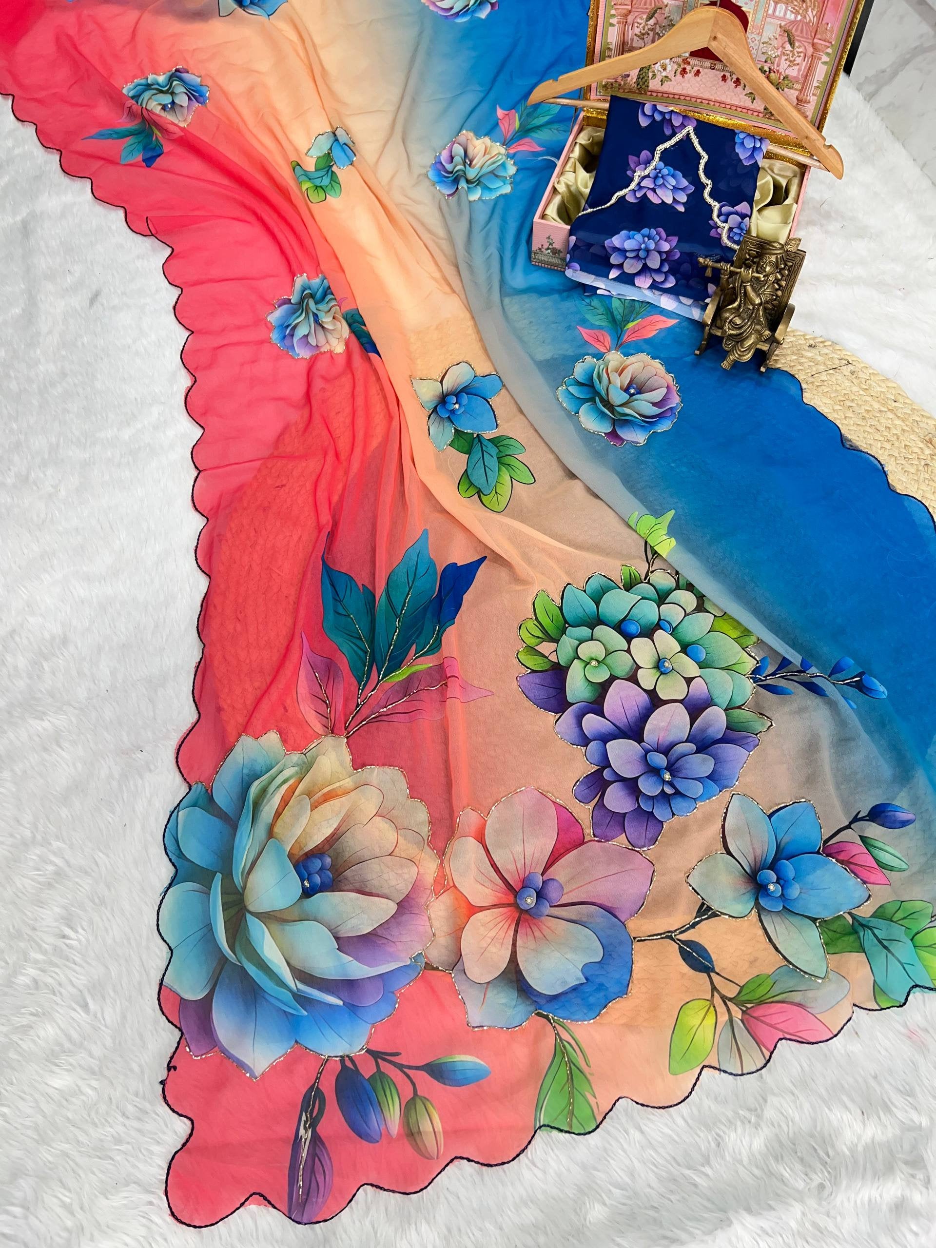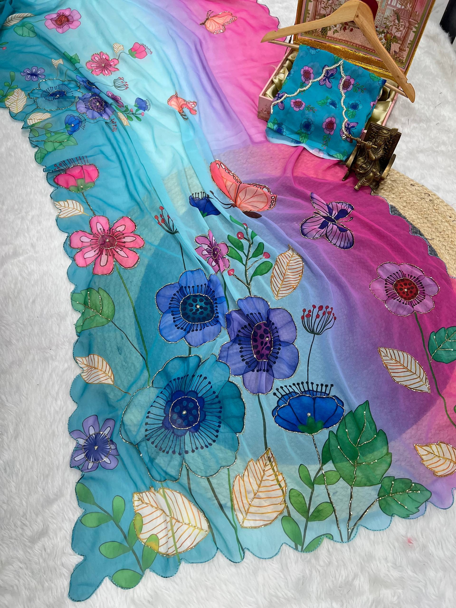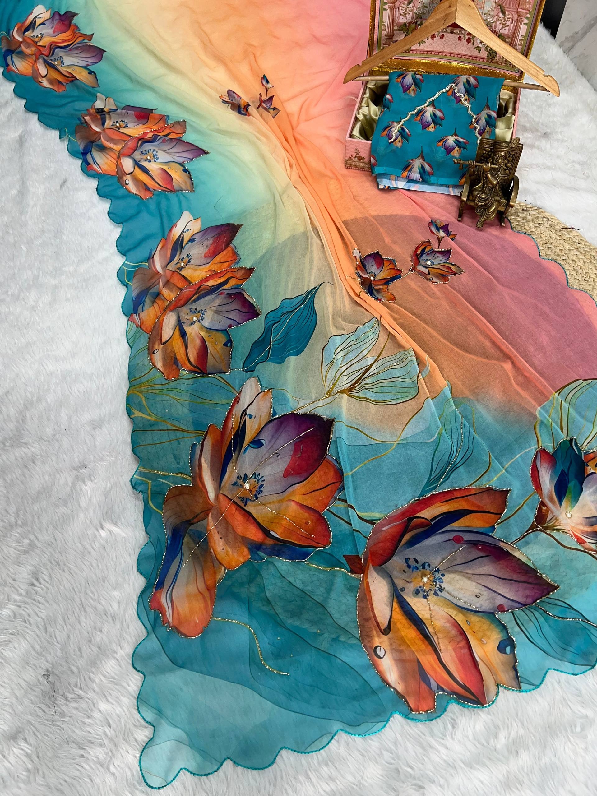 Work: Digital Print with Khatli & Fancy Arri Handwork Handcrafted Designer Saree