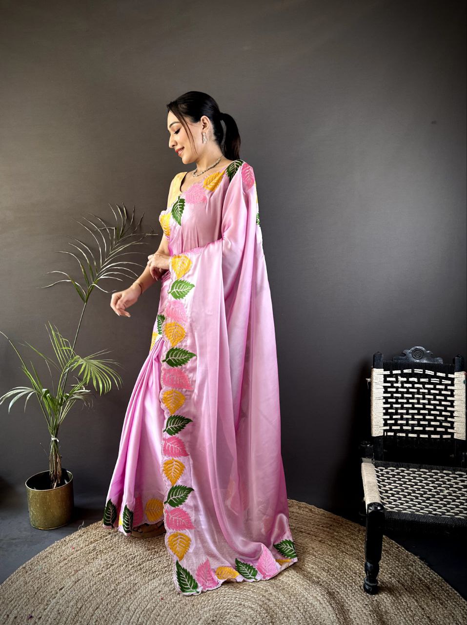Multicolor Leaf Embroidery Saree in Rangoli Silk