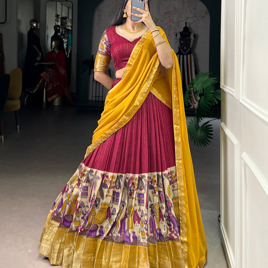 NITRIYA Poly Chanderi Kalamkari Print Lehenga Choli with Zari Stripe & Georgette Dupatta