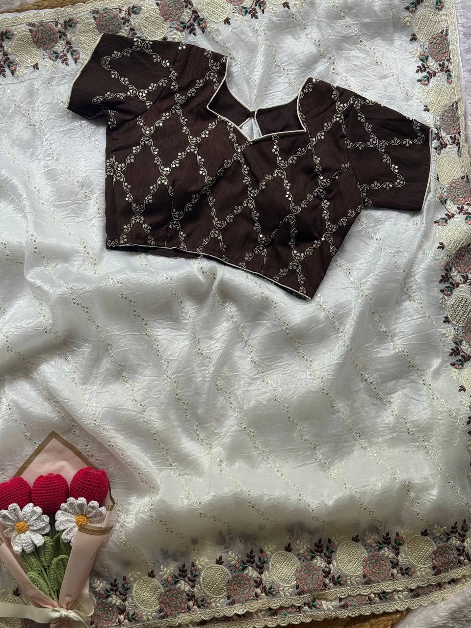 Blouse Fabric: Contrast Silk Embroidery, Sequins & Leheriya Work