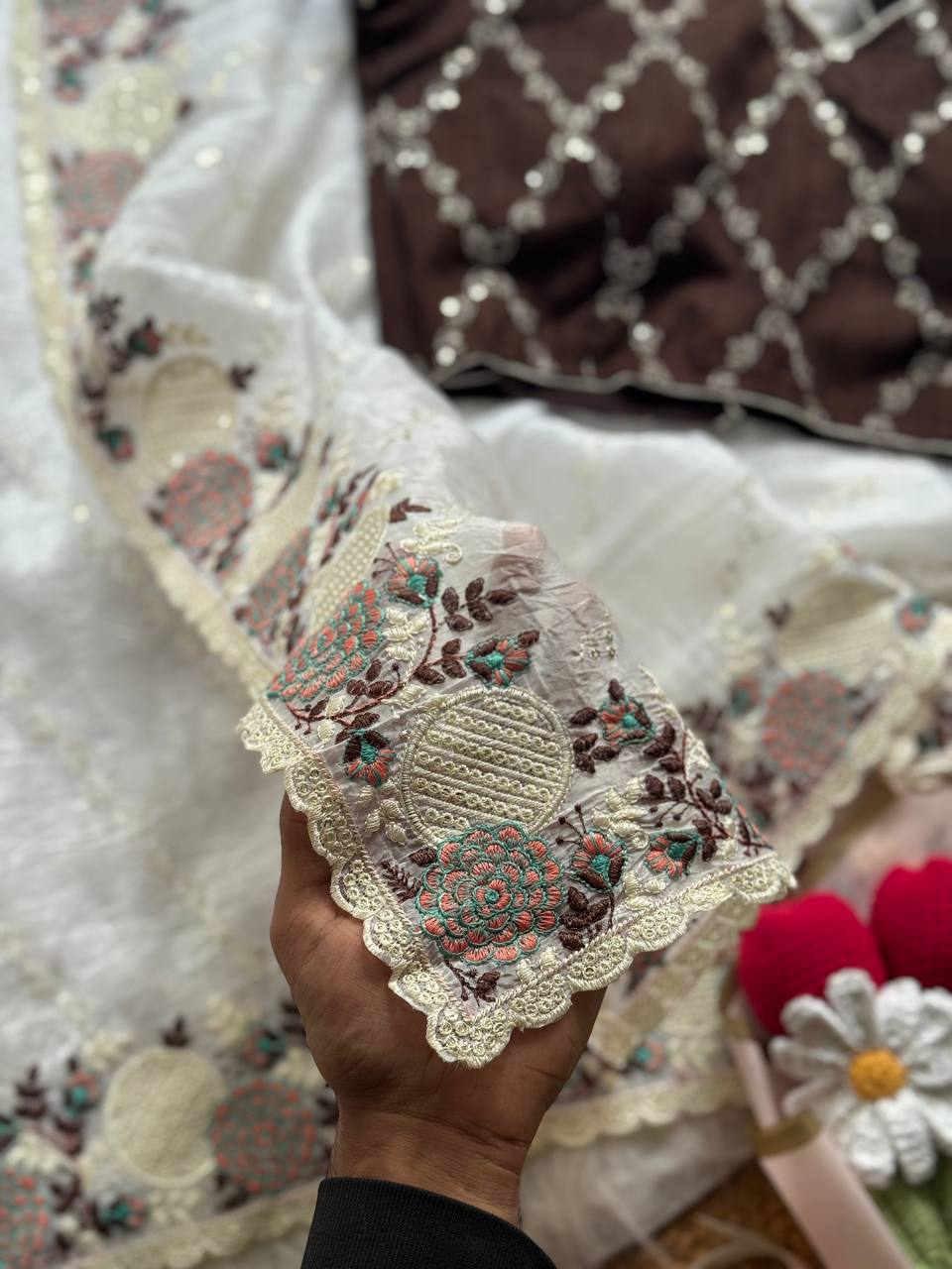 Saree Fabric: Premium Paper Crush Organza Sequins & Thread Weaving with Leheriya Pattern Scallop Border Embroidery