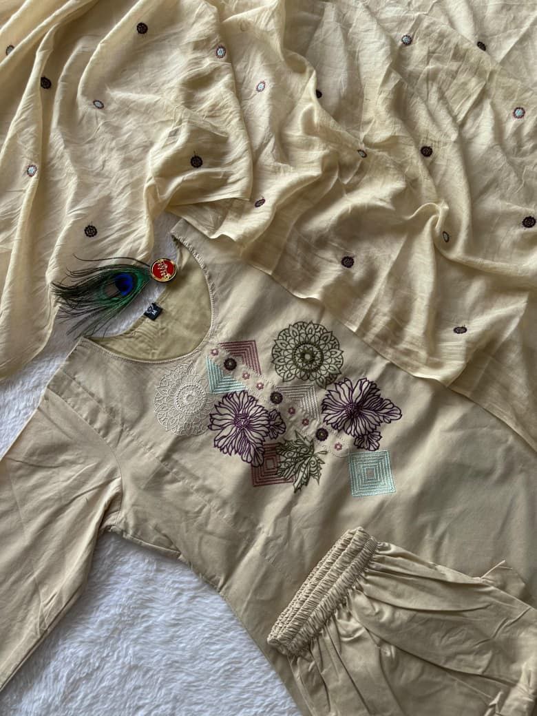 Pure Cotton Embroidered Kurti Set with Mul Cotton Dupatta – Cream | KR-401