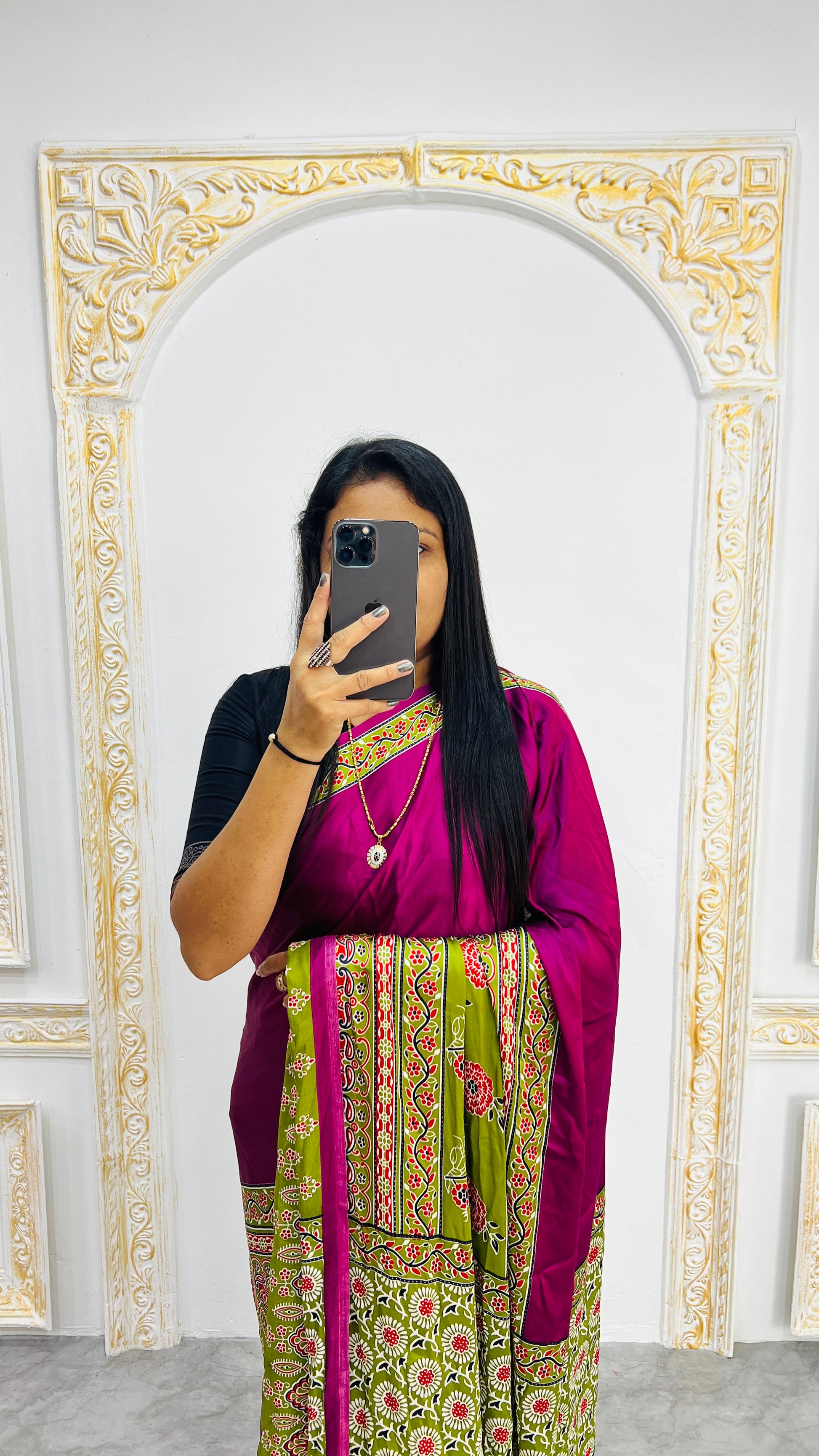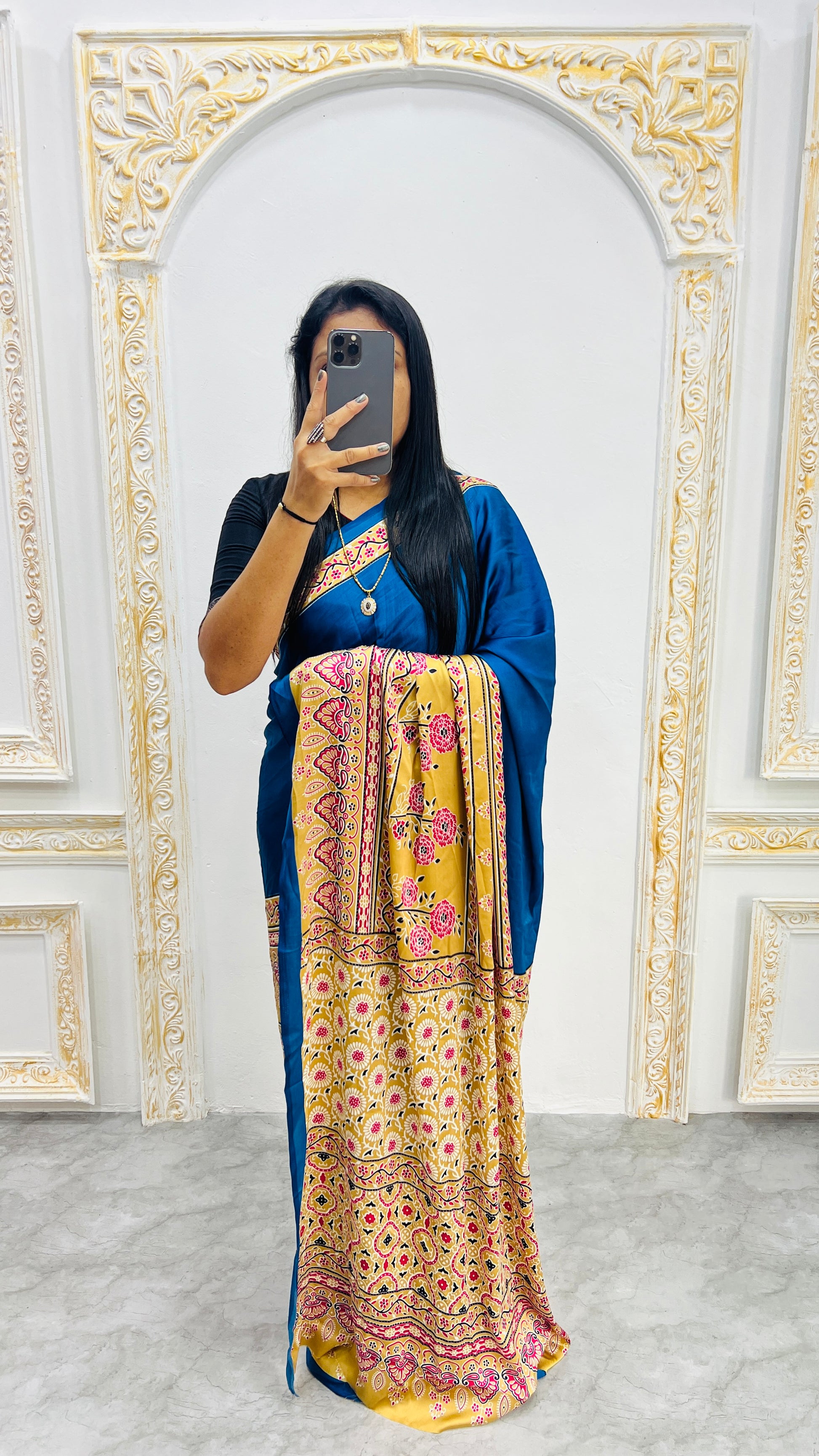 Ajrakh Print Border with Ajrakh Rich Pallu with Contrast Blouse