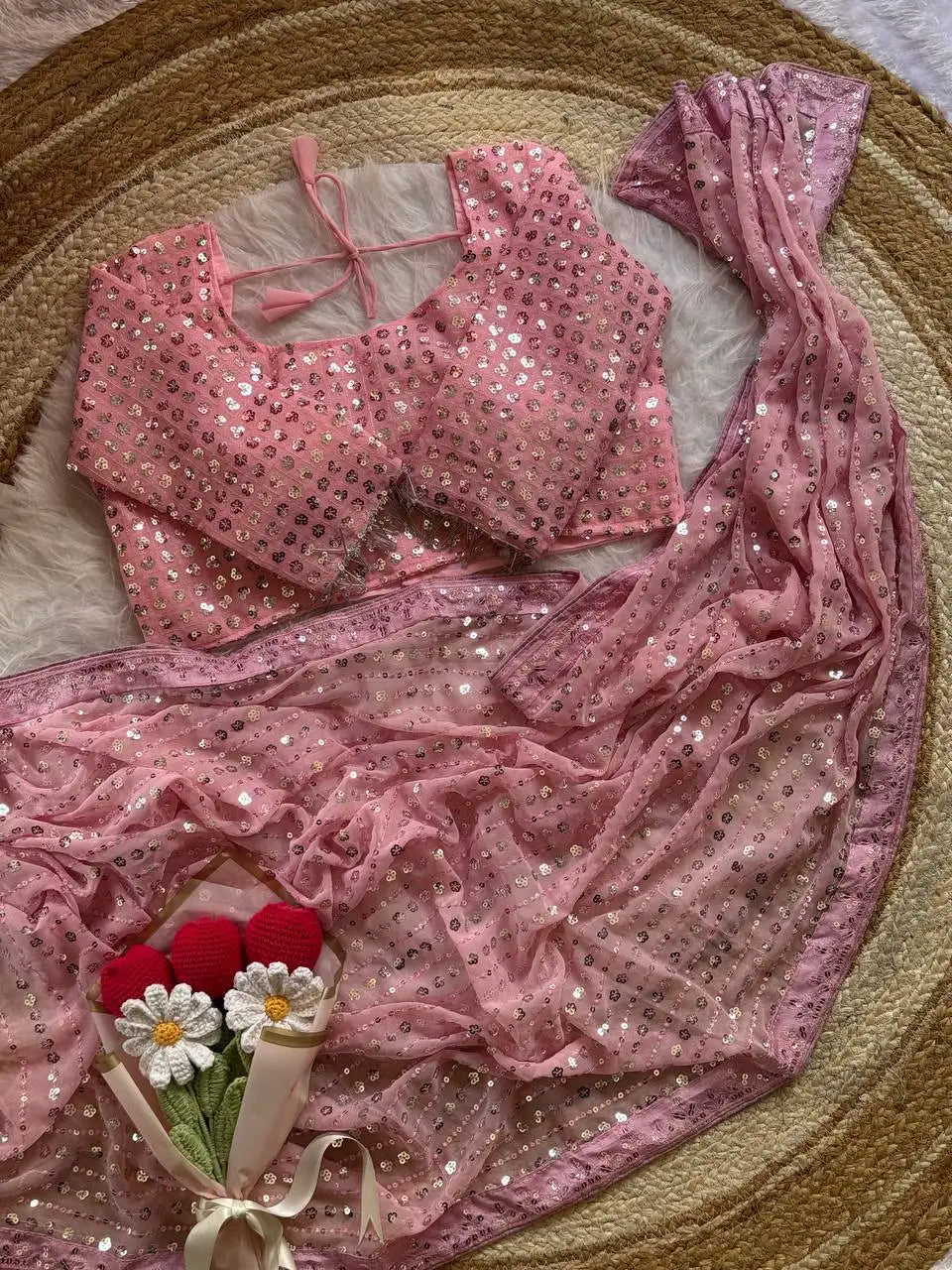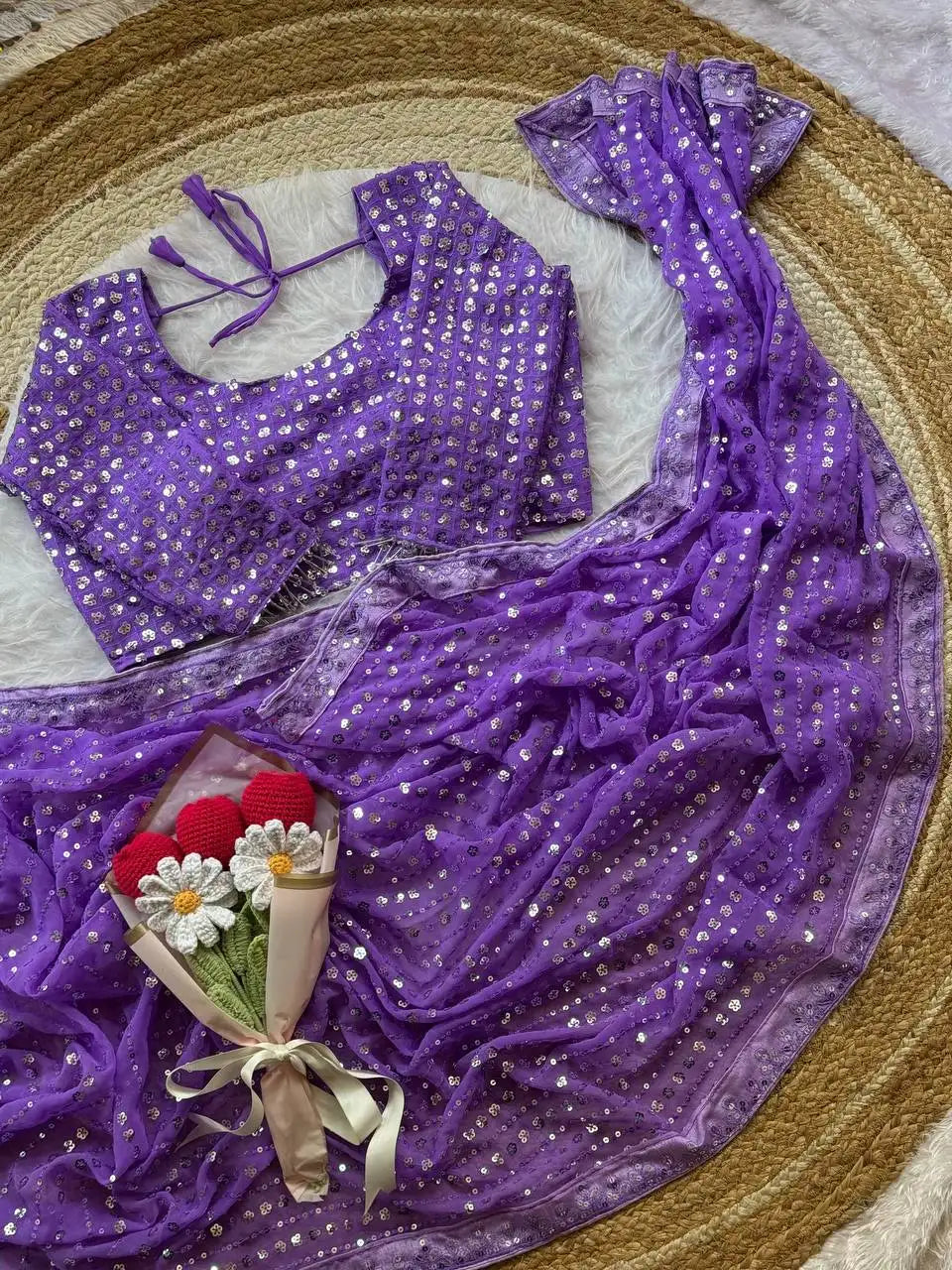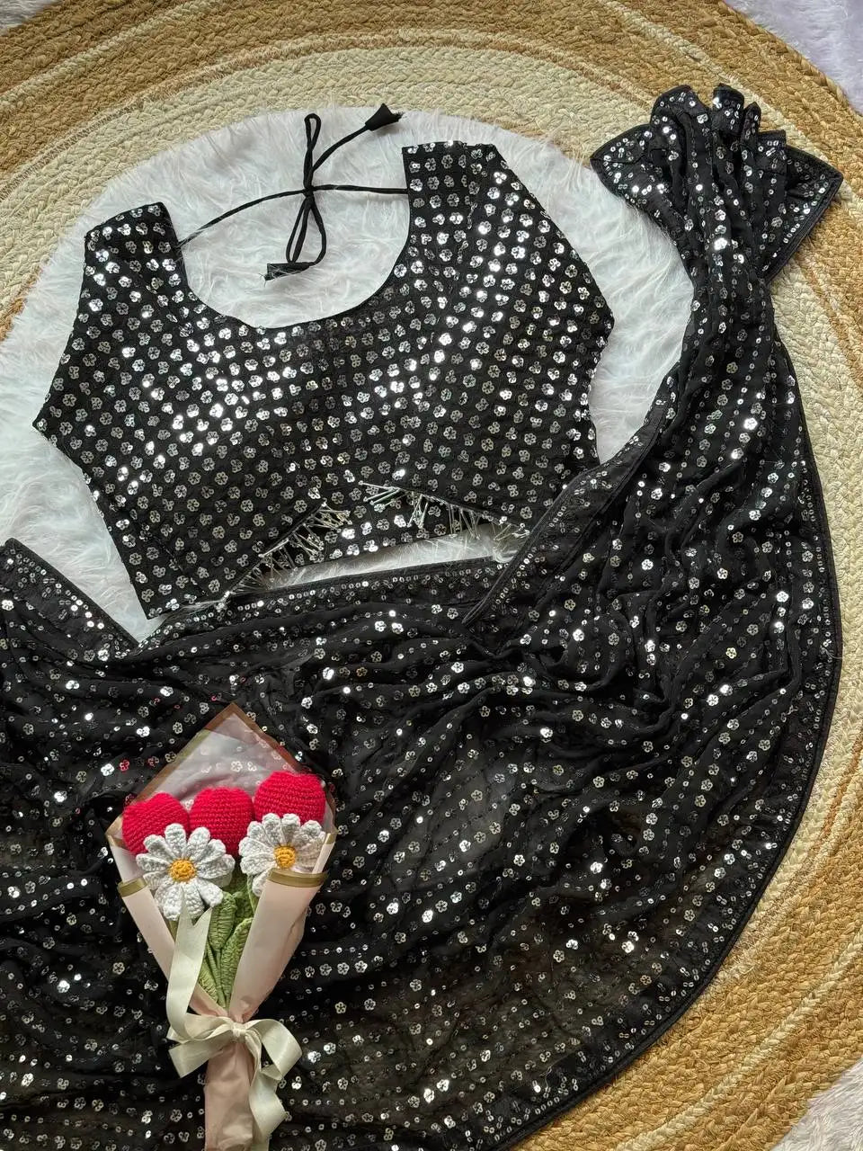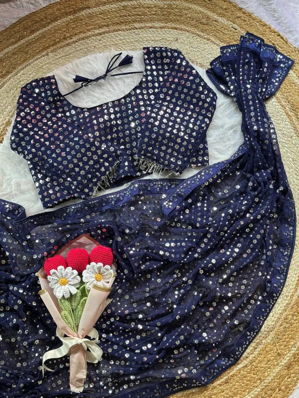 Soft Georgette Saree with Heavy 5mm Sequin Embroidery, Lace Border & Piping - DOLLEE