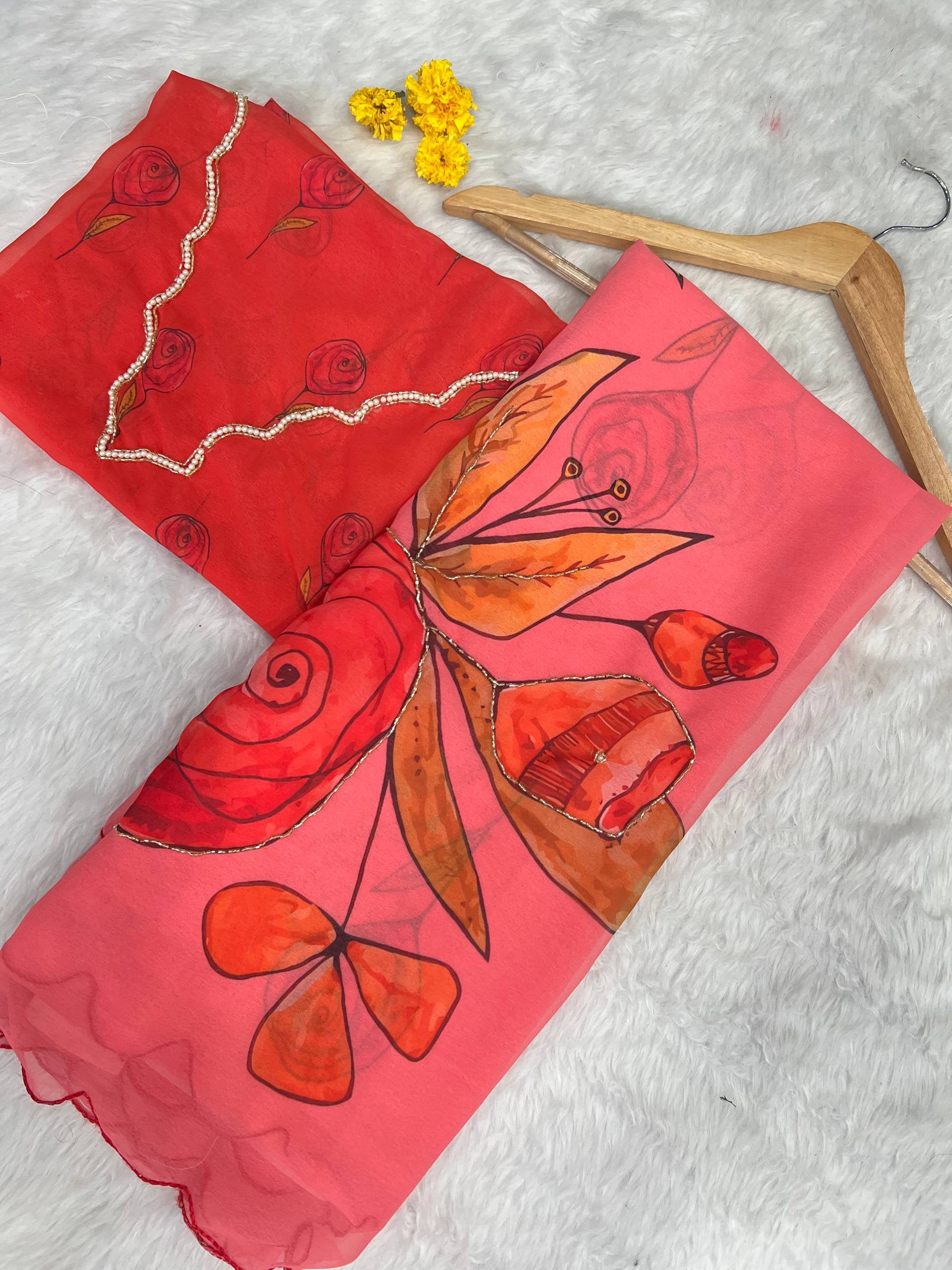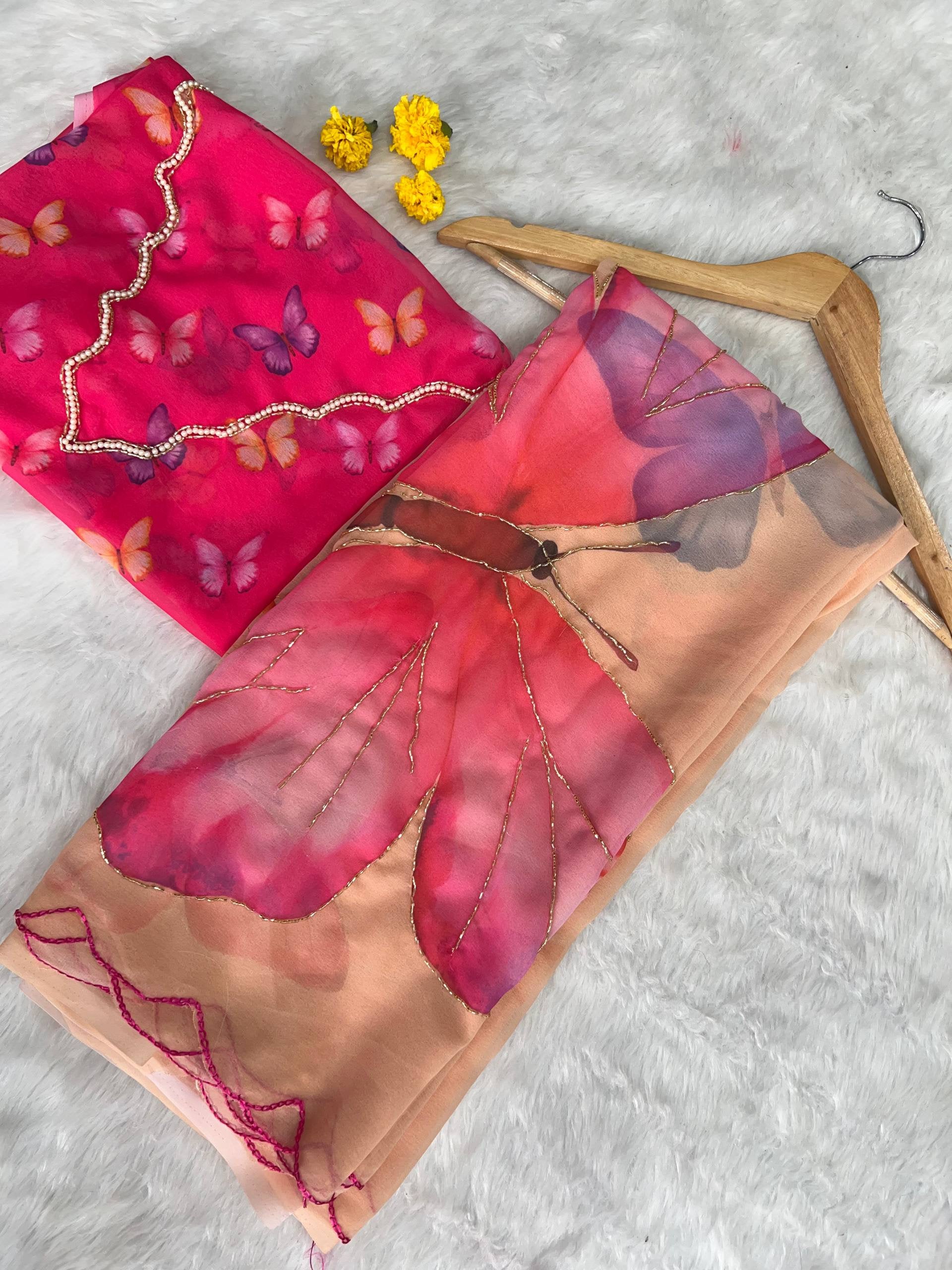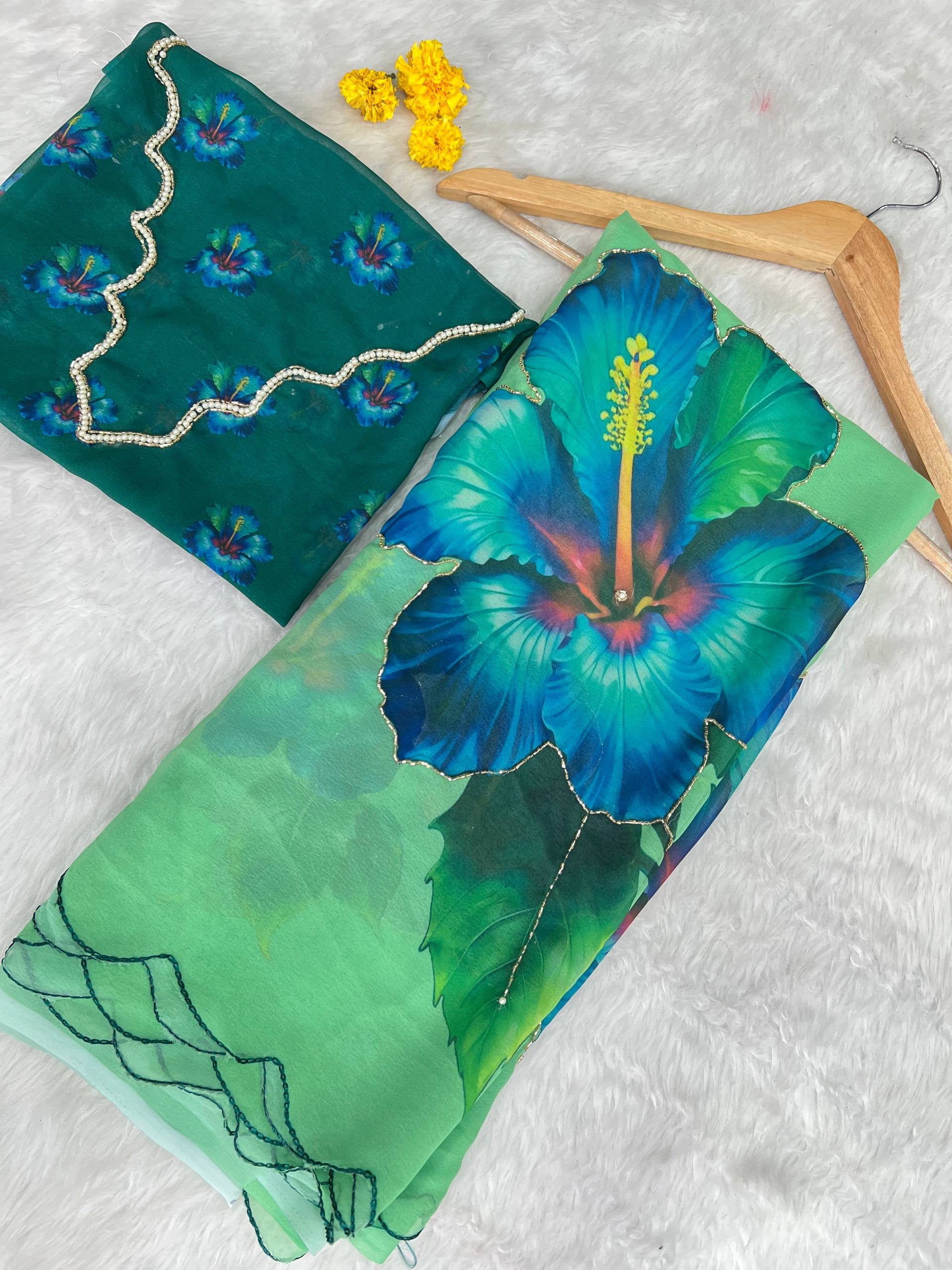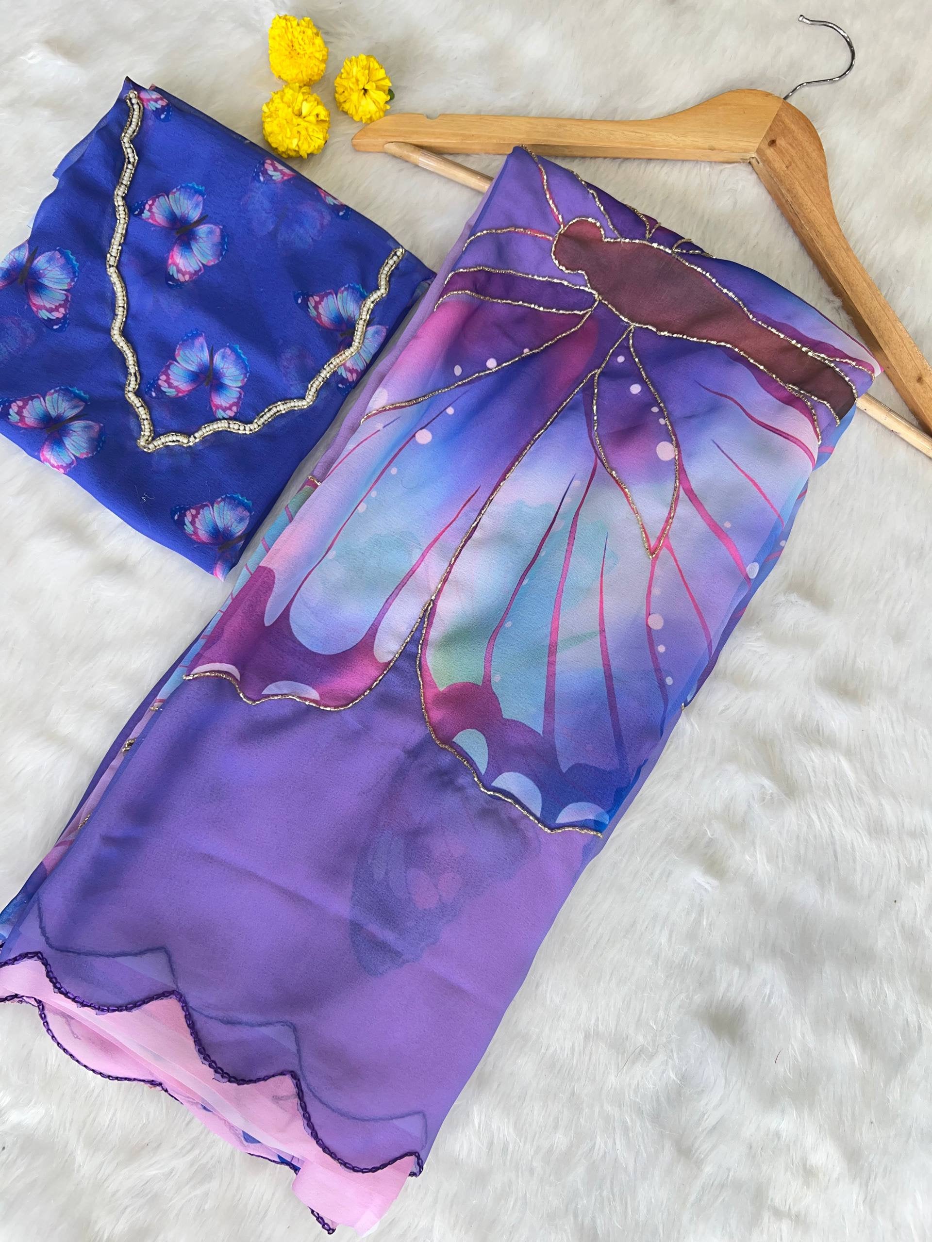 Fabric: Soft Pure Georgette Digital Print with Khatli & Fancy Arri Handwork Designer Handcrafted Saree