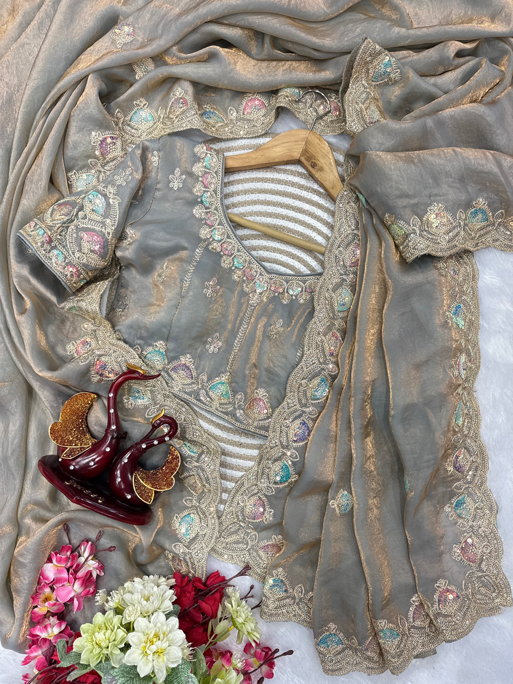 Work: Elegant dual-color sequins with intricate dori embroidery