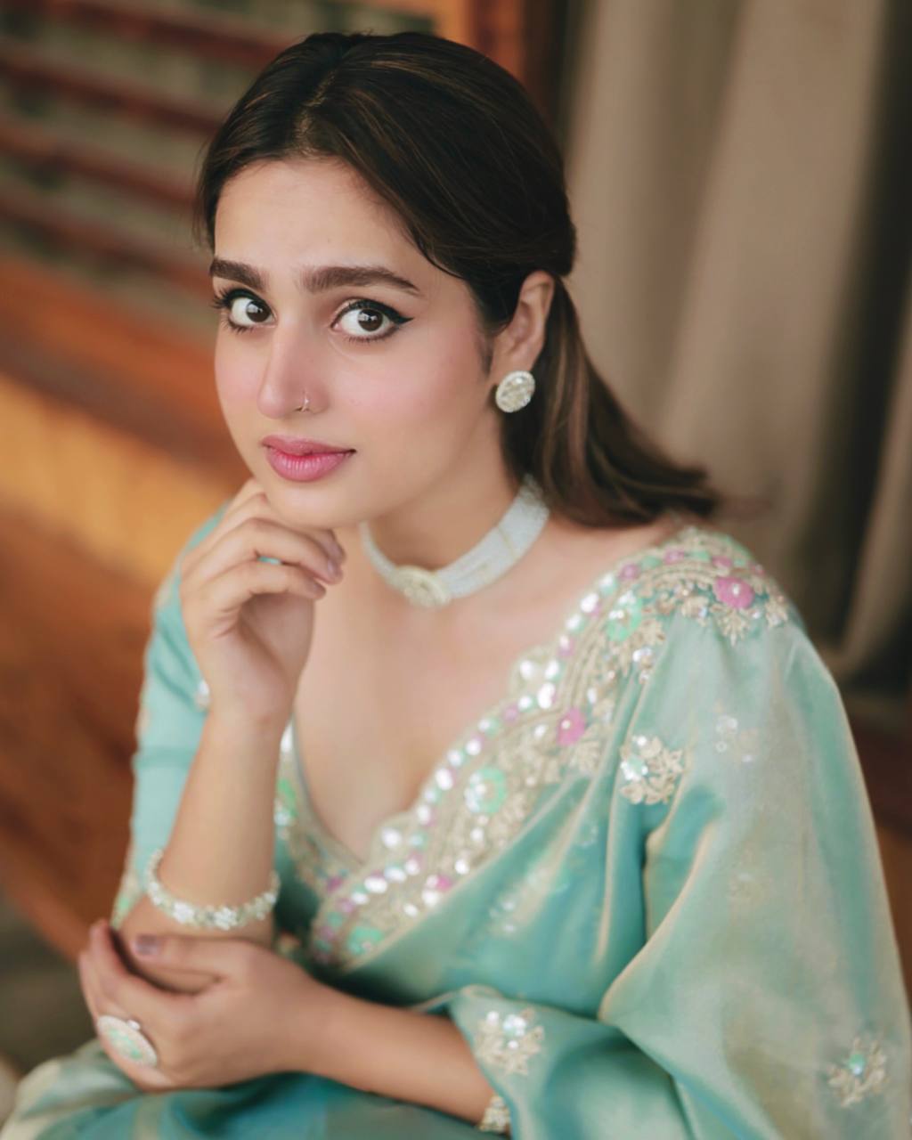 *The ethereal looks resplendent in our space silk saree. The drape showcases a scallop border with embroidery details Matched with a designer blouse, is a vision of majesty.*