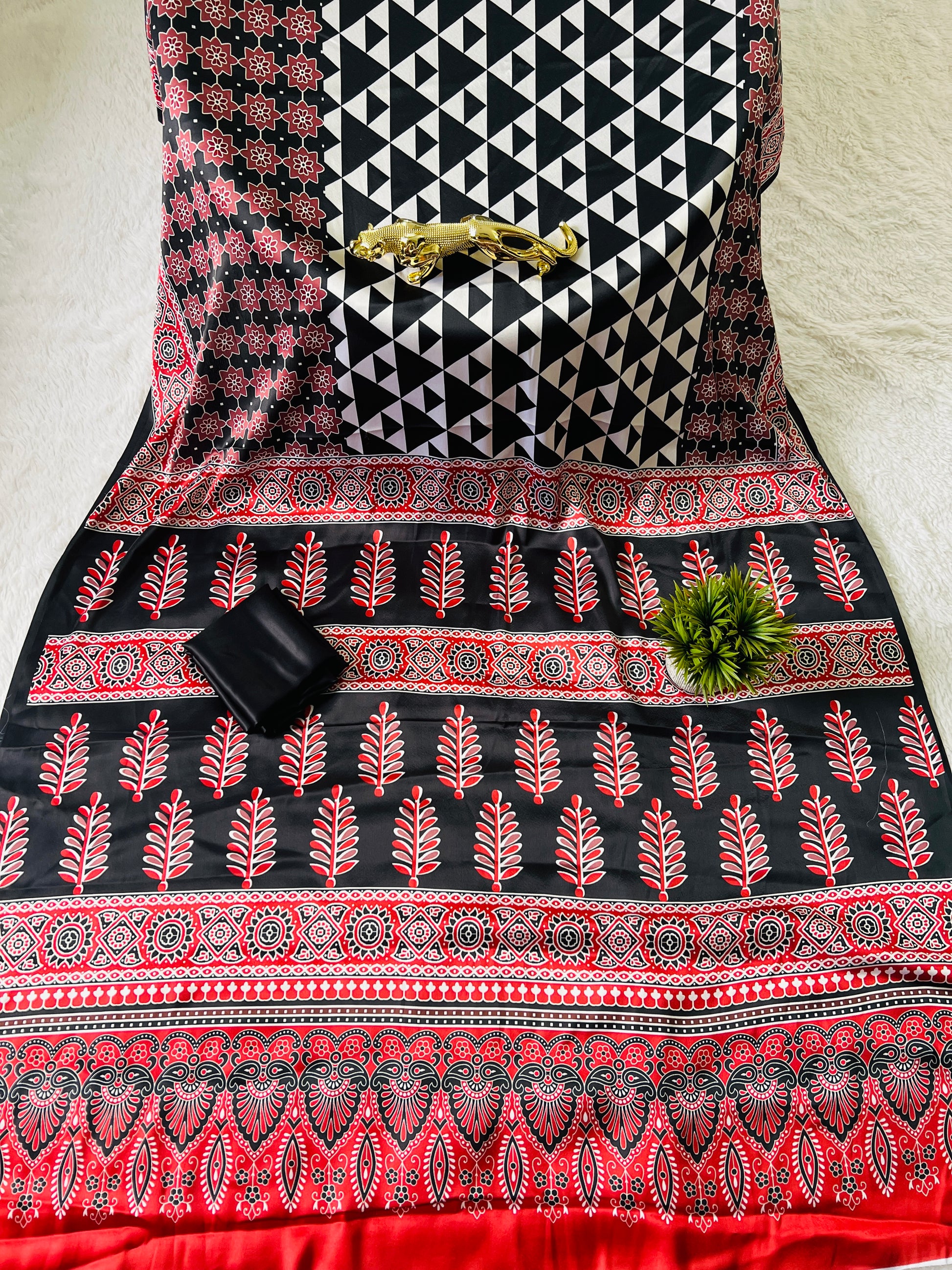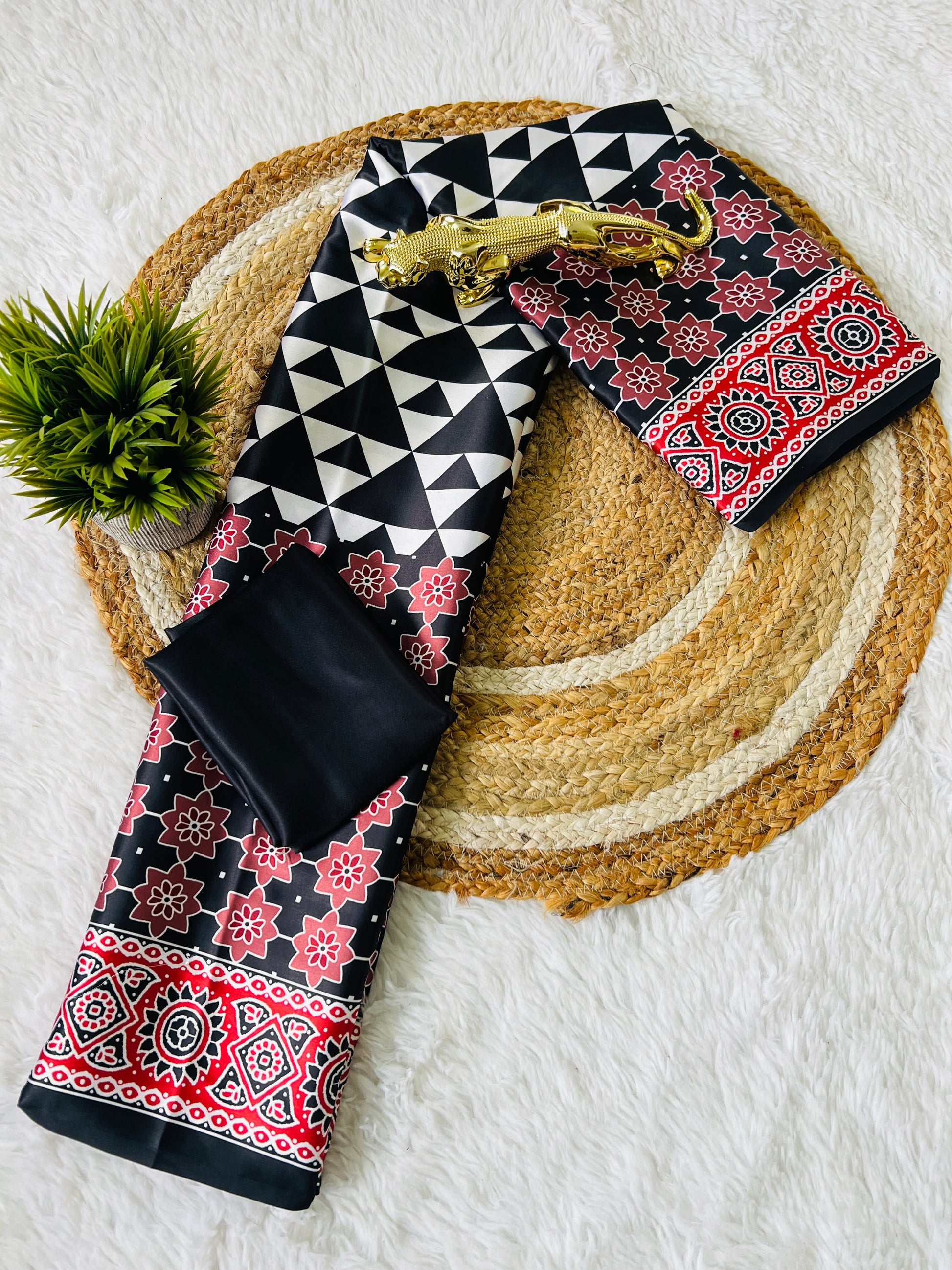 Work : Digital Print Border with Ajrakh Rich Pallu with Contrast Blouse
